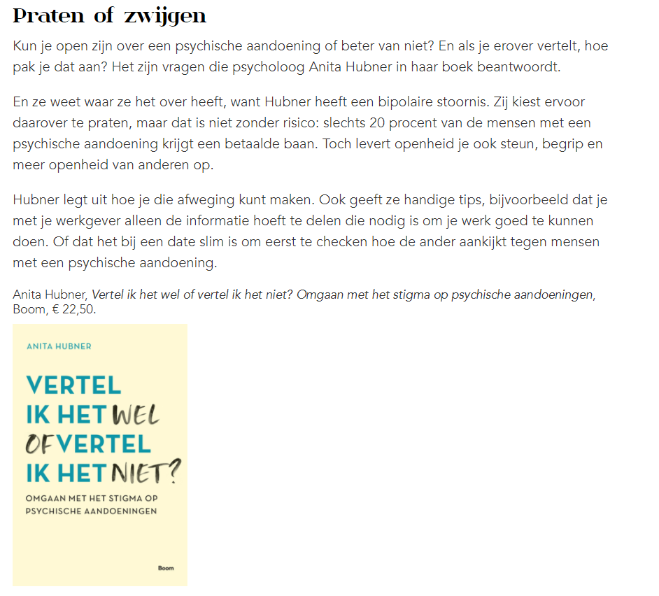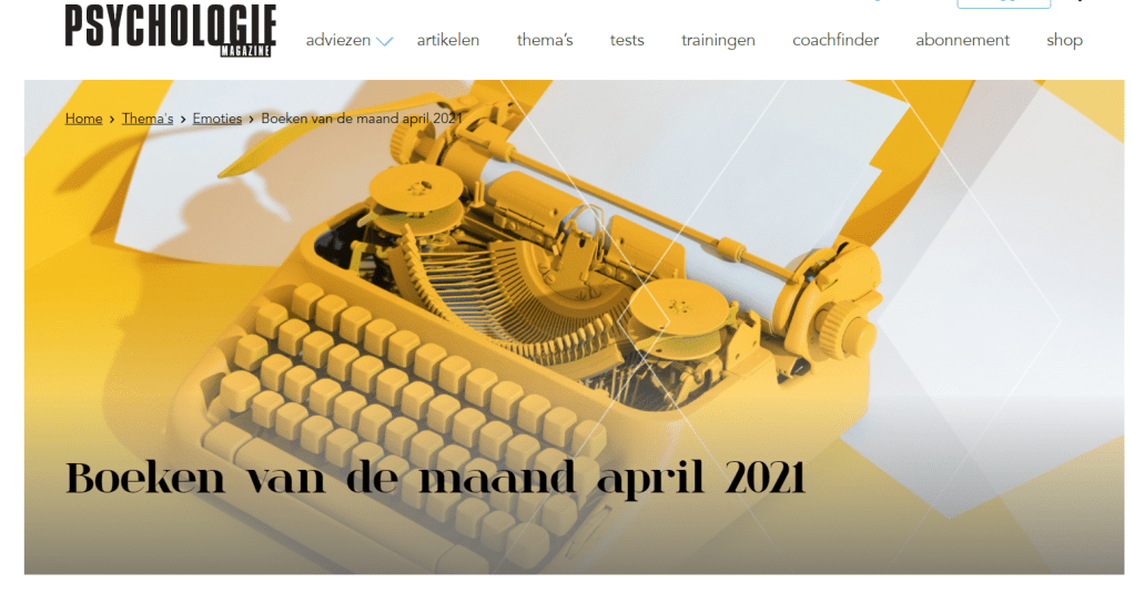 Psychologie Magazine Mijn boek is als Boek van de maand april 2021 getipt in Psychologie Magazine. Klik hier voor de link. Dit delen: Klik om op LinkedIn te delen (Opent in een nieuw venster) LinkedIn Klik om te delen op X (Opent in een nieuw venster) X Klik om te delen op Facebook (Opent in een nieuw venster) Facebook Meer Klik om dit te e-mailen naar een vriend (Opent in een nieuw venster) E-mail Klik om af te drukken (Opent in een nieuw venster) Print Klik om te delen op WhatsApp (Opent in een nieuw venster) WhatsApp